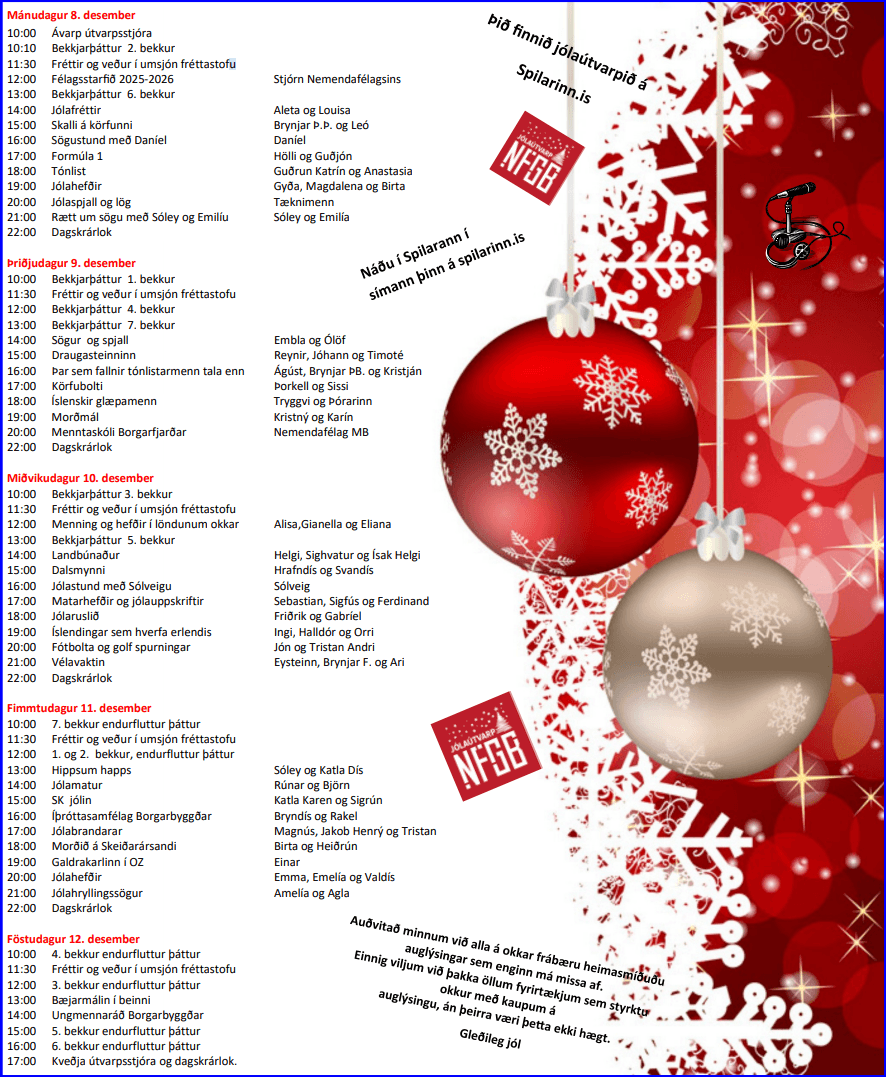 Árlegt Jólaútvarp Nemendafélags Grunnskólans í Borgarnesi verður sent út frá Óðali 8.-12. desember frá kl. 10:00-22:00. Eins og undanfarin ár verður fjölbreytt og skemmtileg dagskrá í boði. Fyrri part dags verður útvarpað áður hljóðrituðum þáttum yngri bekkja grunnskólans en síðan flytja unglingarnir sína þætti í beinni útsendingu. Handritagerð fór fram á skólatíma þar sem jólaútvarpið hefur verið tekið sem sérstakt …