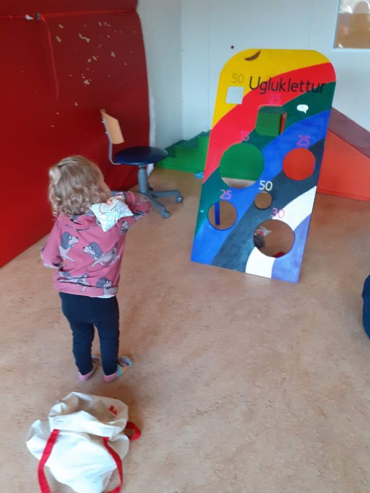 Starfsfólk Öldunnar kom Uglukletti skemmtilega á óvart með handsmíðuðu kastspjaldi úr krossvið og grjónapúðum til að kasta í það!