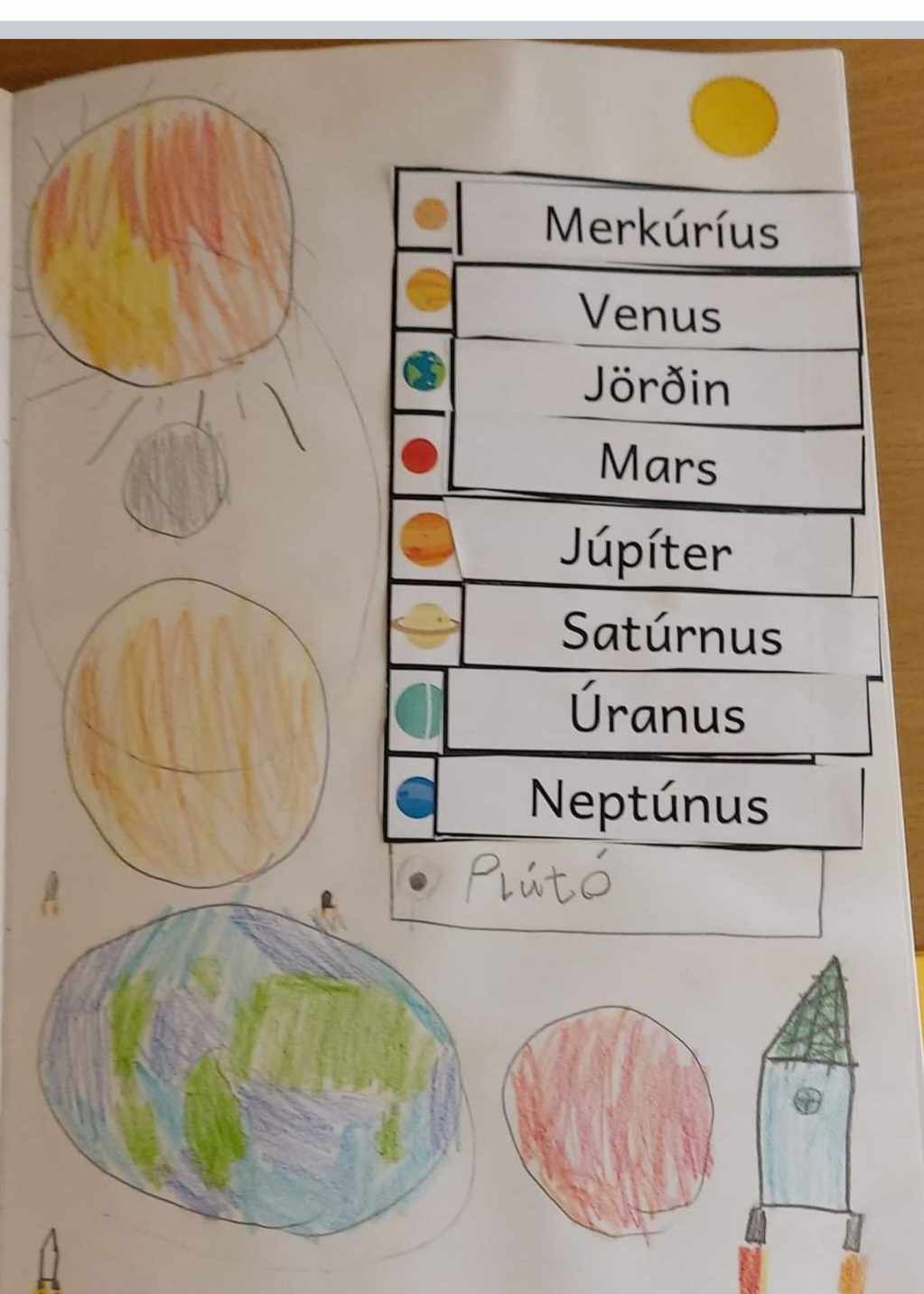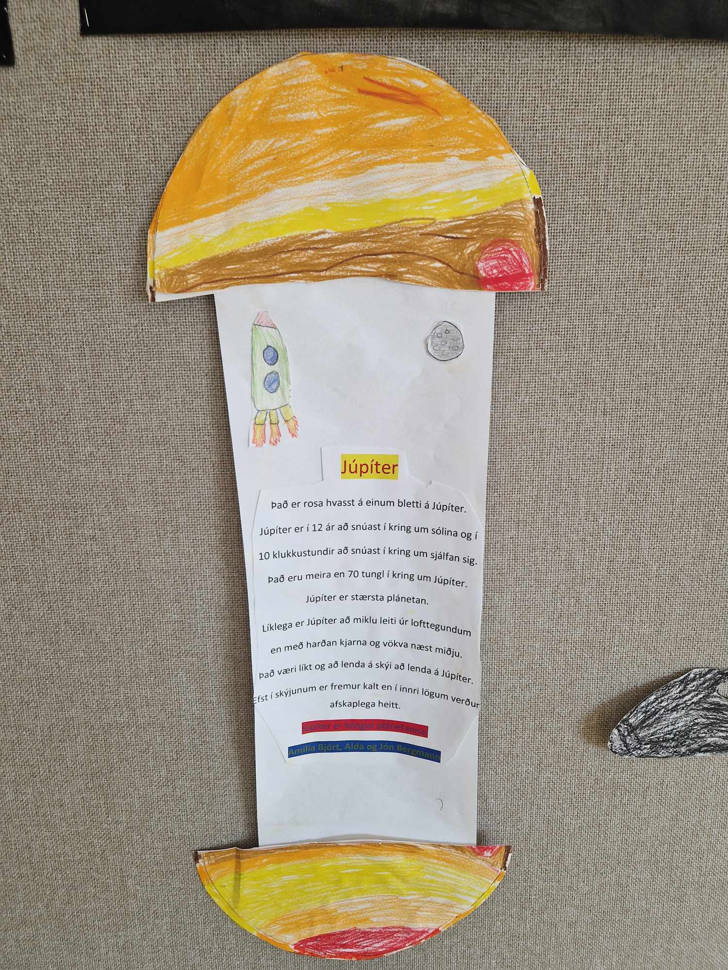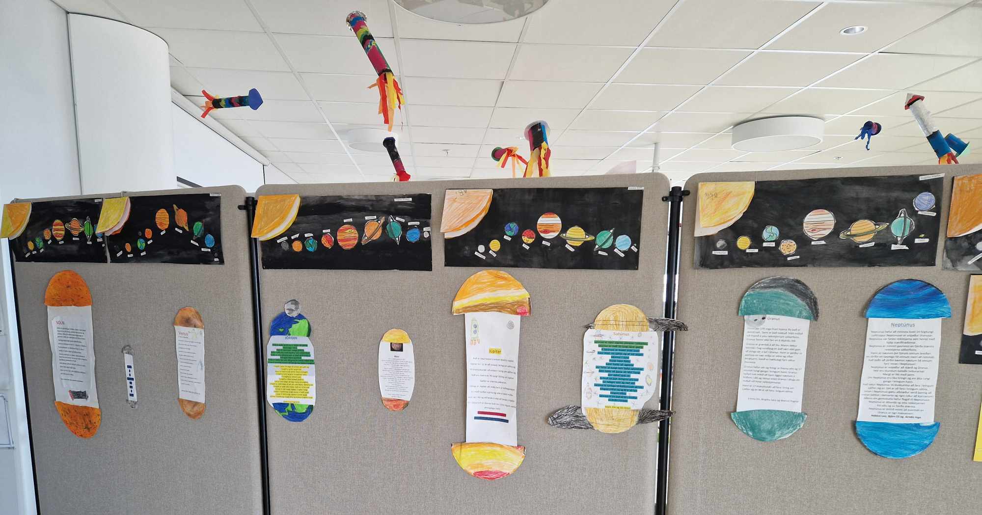 Hópaverkefnið var þannig að hver hópur dró eina plánetu og vann texta um helstu einkenni hennar upp úr efni sem þau fundu bæði í kennslubókum og á netinu. Einnig bjuggu hóparnir til nokkrar spurningar úr textanum til að spyrja áhorfendur. Síðan var plánetan teiknuð upp, klippt í tvennt og textinn var límdur inn á milli. Hver hópur kynnti svo plánetuna sína og spurði spurninga upp úr textanum fyrst fyrir samnemendum og síðan var foreldrum/forráðamönnum boðið og koma og horfa á og skoða afraksturinn í skólastofunni.