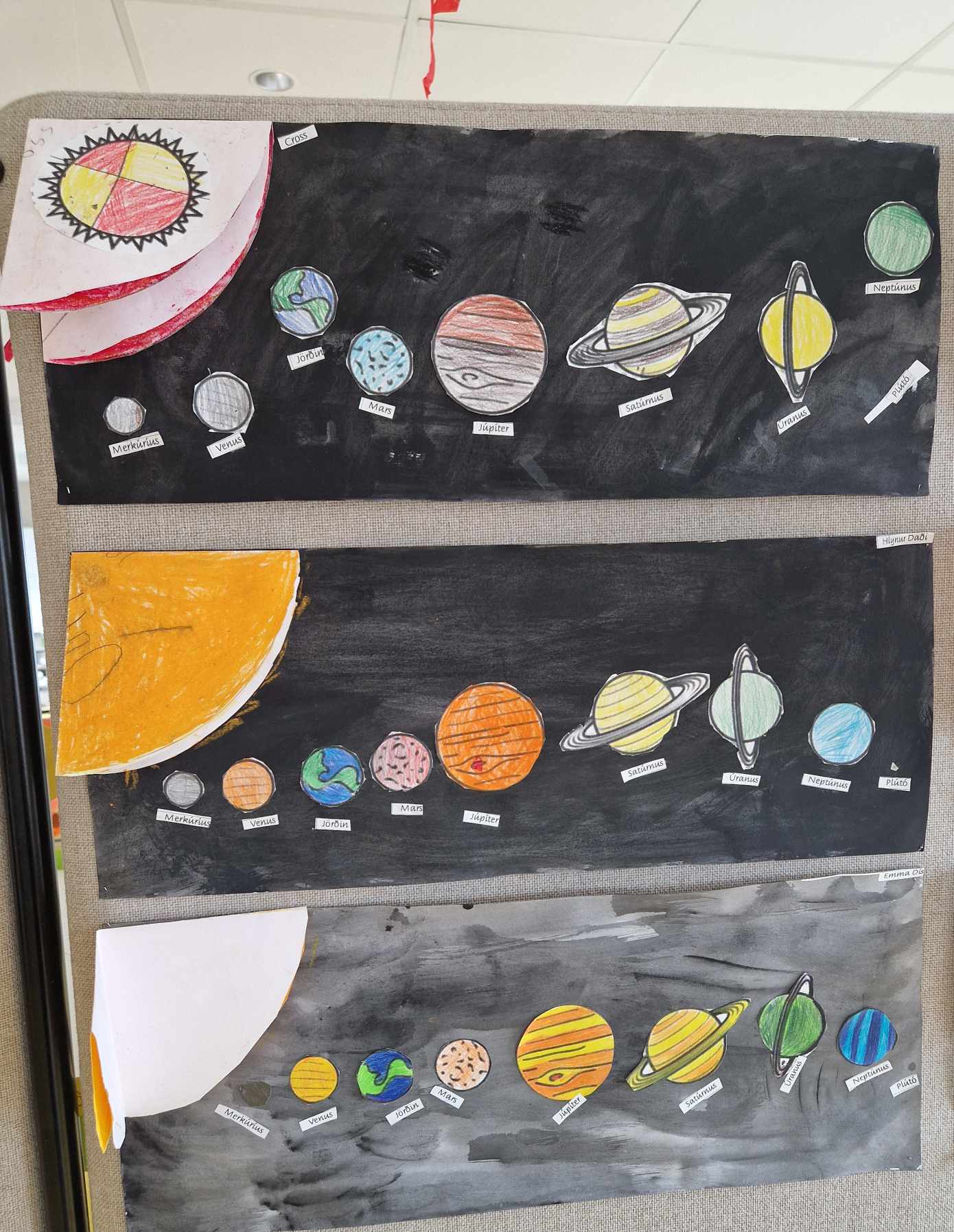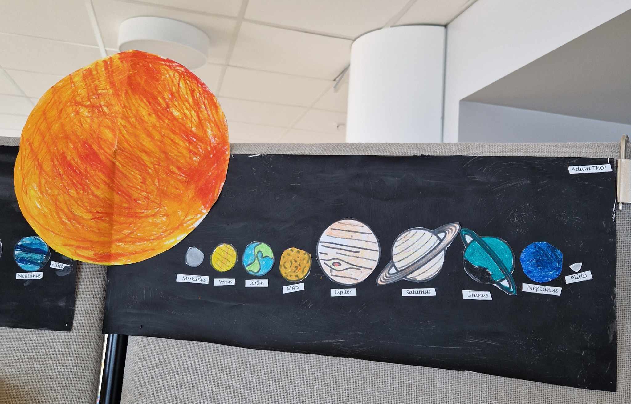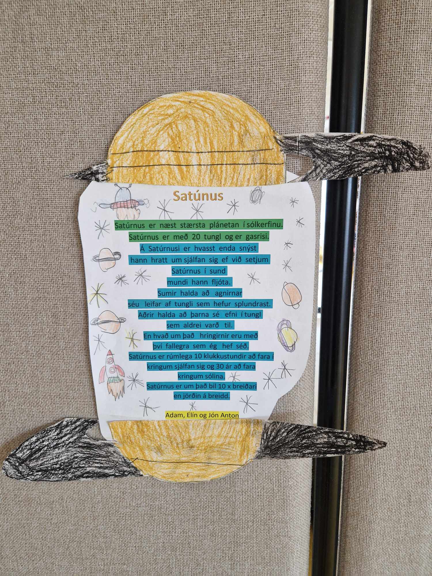 Hópaverkefnið var þannig að hver hópur dró eina plánetu og vann texta um helstu einkenni hennar upp úr efni sem þau fundu bæði í kennslubókum og á netinu. Einnig bjuggu hóparnir til nokkrar spurningar úr textanum til að spyrja áhorfendur. Síðan var plánetan teiknuð upp, klippt í tvennt og textinn var límdur inn á milli. Hver hópur kynnti svo plánetuna sína og spurði spurninga upp úr textanum fyrst fyrir samnemendum og síðan var foreldrum/forráðamönnum boðið og koma og horfa á og skoða afraksturinn í skólastofunni.