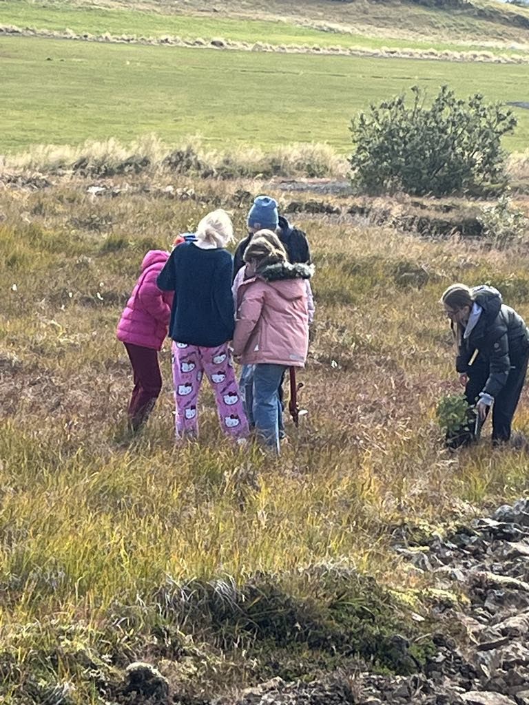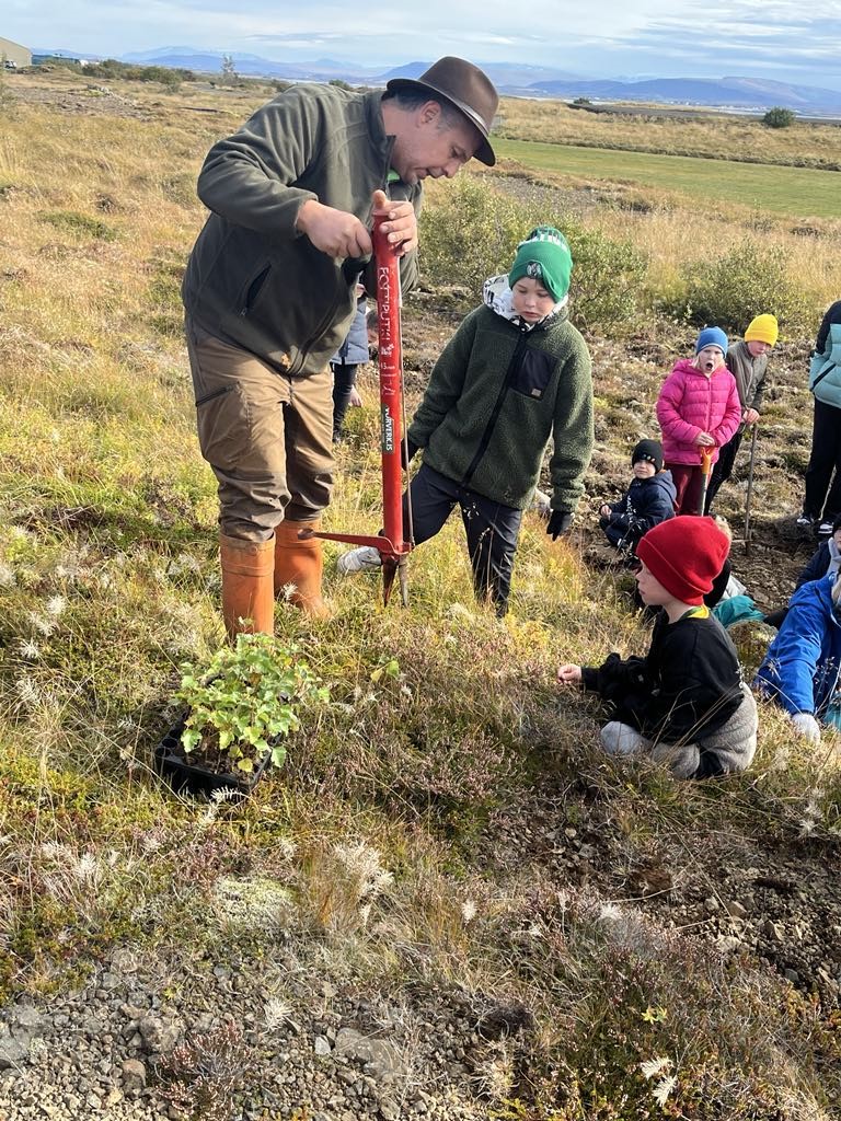 Í dag, föstudag, fóru vinabekkirnir 4. og 9. bekkur og gróðursettu tré sunnan við flugvöllinn hér ofan við Borgarnes. Þetta er árlegur viðburður og hefur Grunnskólinn í Borgarnesi í samstarfi við Skógræktarfélag Borgarfjarðar gróðursett tré á vegum Yrkjusjóðsins allt frá árinu 1992. Pavle Estrajher formaður skógræktarfélagsins var með fræðslu fyrir hópinn og hjálpaði þeim við gróðursetninguna. Þau notuðust við gróðursetningargeyspur og höfðu þau gaman af að læra á þær. Hópurinn fékk frábært veður í dag og var mikill áhugi fyrir hendi hjá krökkunum.