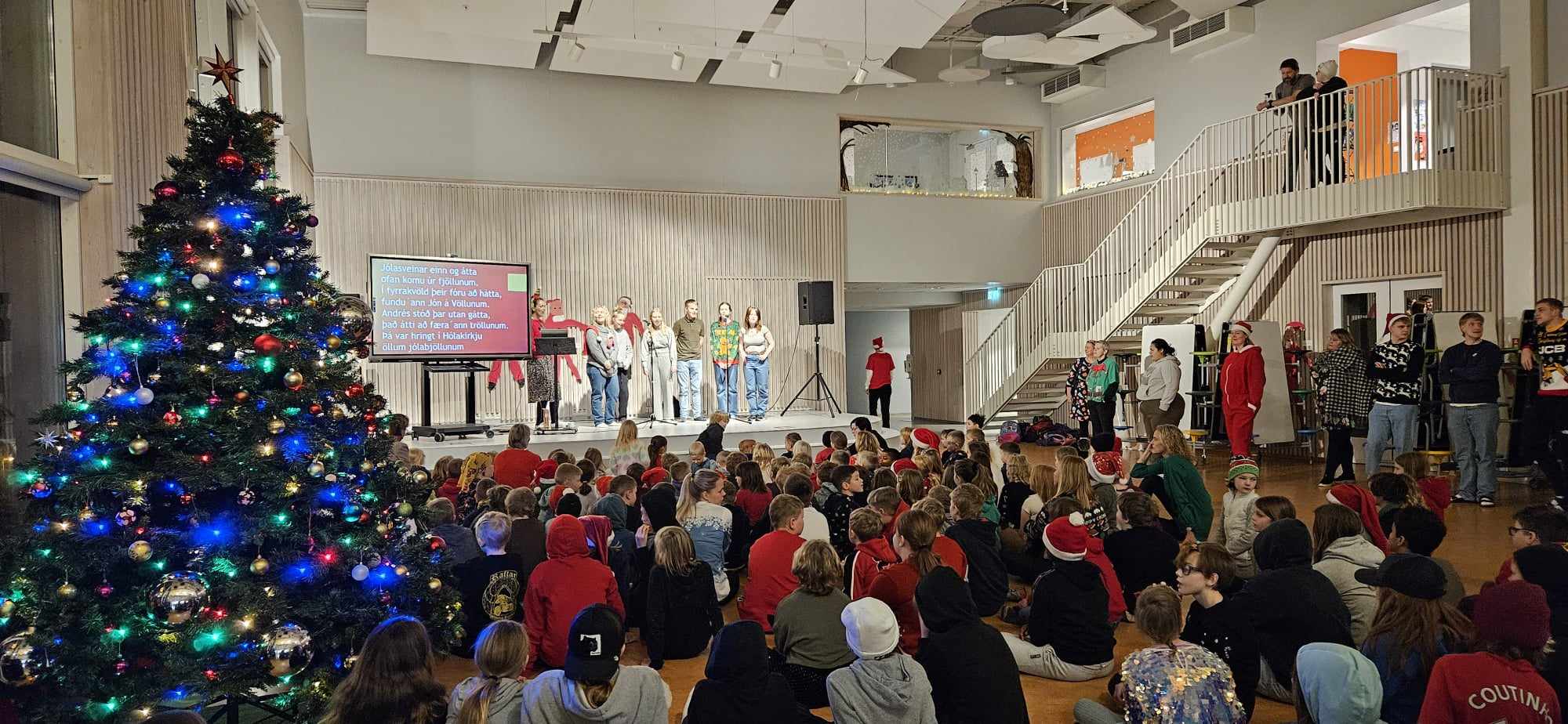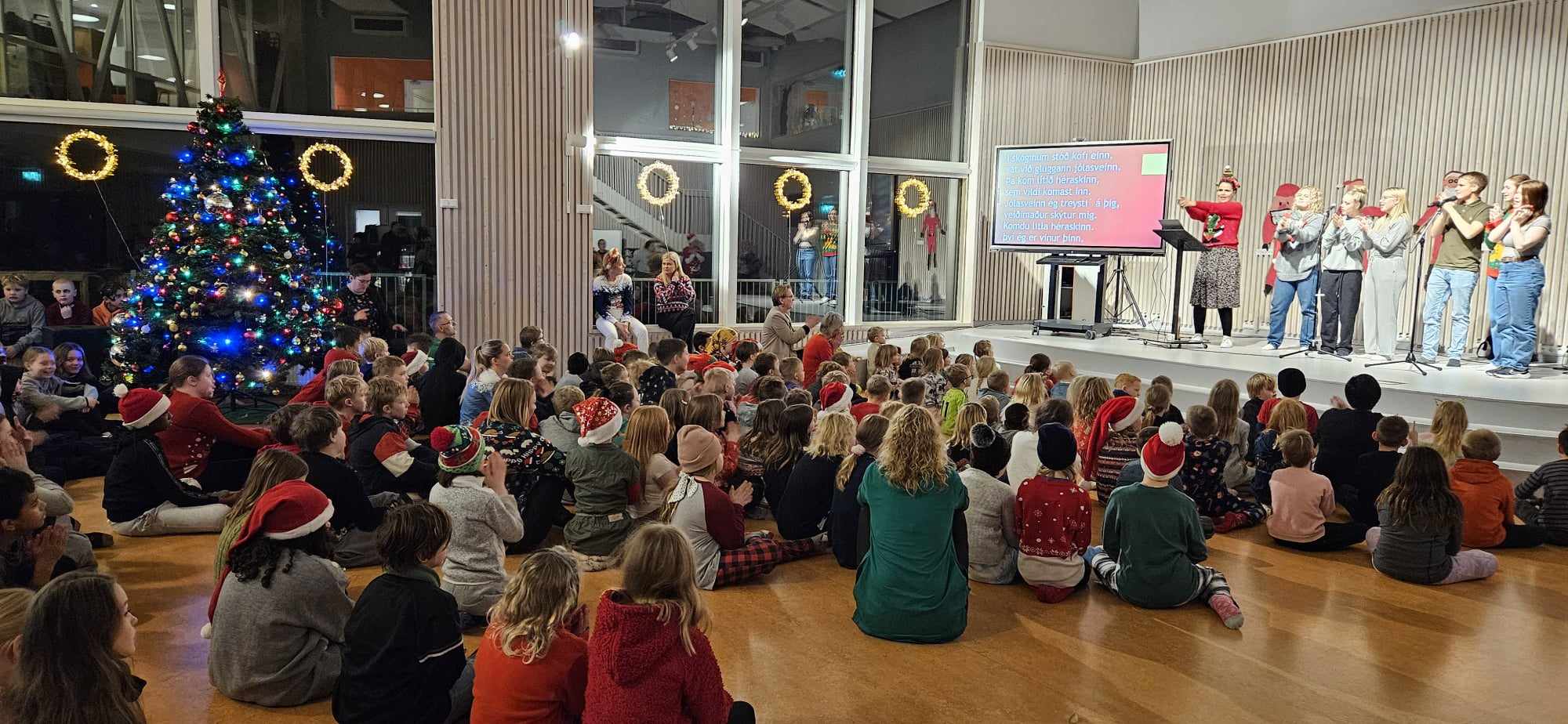 Í dag var jólasöngur í Salnum þar sem allir bekkir skólans komu saman og sungu jólalög. Nú fer að líða að jólafríi og er farið að bera á jólaspenningi í krökkunum. Þá er gott að geta aðeins brotið upp hefðbundna kennslustund með smá samveru í Salnum.