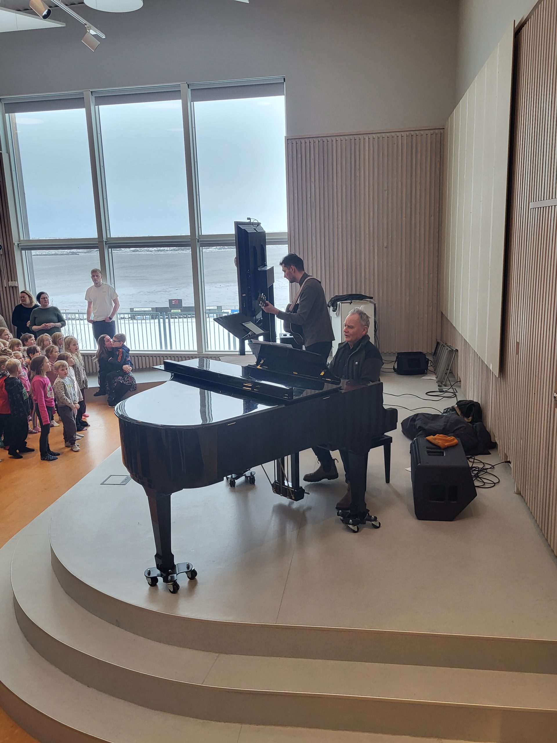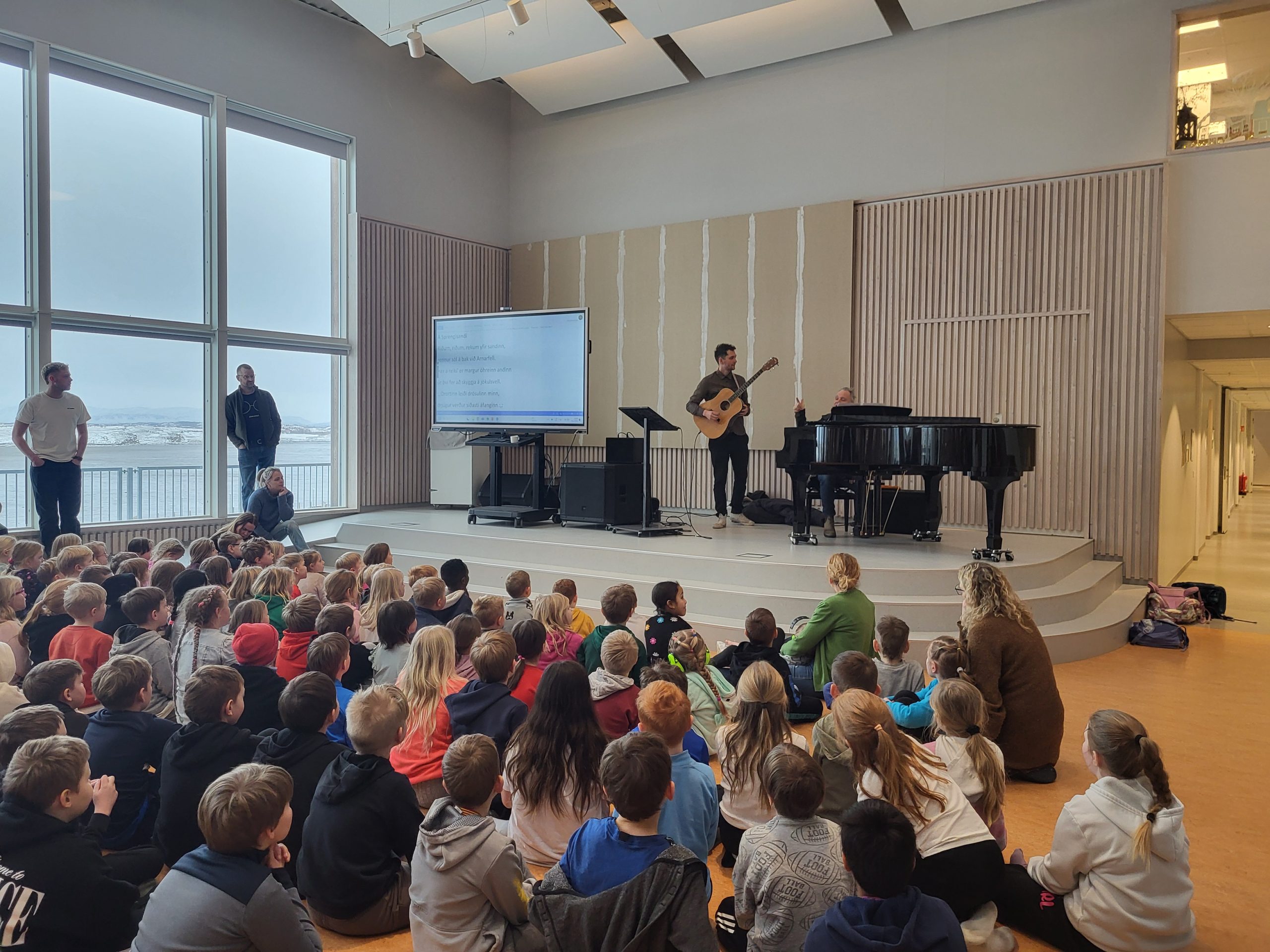 Föstudaginn 31.jan komu Óli Flosason og Árni Freyr til okkar á vegum Listaskóla Borgarfjarðar. Þeir komu og spiluðu á gítar og píanó meðan að 1. b – 7. b sungu lögin Á sprengisandi, Kvæðið um fuglana, Lagið um það sem er bannað og Ég er kominn heim.